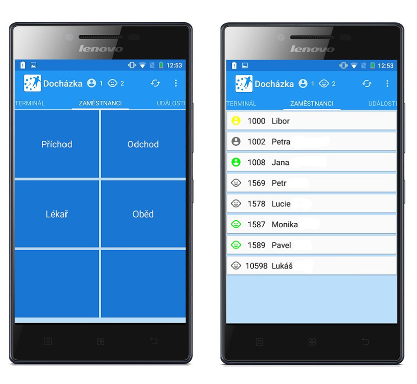Příchod a odchod zaměstnance (případně jeho odchody na oběd, k lékaři, na přestávku…) se eviduje přiblížením identifikačního čipu (přívěšek na klíče) k NFC čidlu mobilního telefonu. Administrátorské nastavení umožňuje také nastavit režim záznamů událostí bez použití čipu (tlačítkem v mobilní aplikaci). Aplikace mobilního terminálu zaznamená čas a účel události do vlastní paměti a takto shromažďované informace předá (dávkově na vyžádání, není nutné trvalé připojení) pomocí Internetového připojení do databáze docházkového systému k dalšímu zpracování (kontrola přítomnosti, zpracování mzdových podkladů…). Mobilní terminál má vedoucí pracovník vždy u sebe (v kapse), nepotřebuje specializovaný docházkový terminál (s nevýhodami ve velikosti, nutnosti napájení a připojení k počítačové síti), lze zobrazit seznam aktuálně přítomných pracovníků.