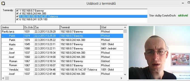 Funkce poskytuje online přehled záznamů z terminálů. V přehledu uvidíte aktuální transakce prováděné na terminálech s možností zobrazení fotky z přístupové transakce s možností porovnání s referenční fotkou z přístupového systému. Toto lze využít například ve vrátnici, kde vrátný ihned vidí průchod přes přístupový terminál a má možnost porovnat příchozího člověka podle referenční fotky nahrané v přístupovém systému.